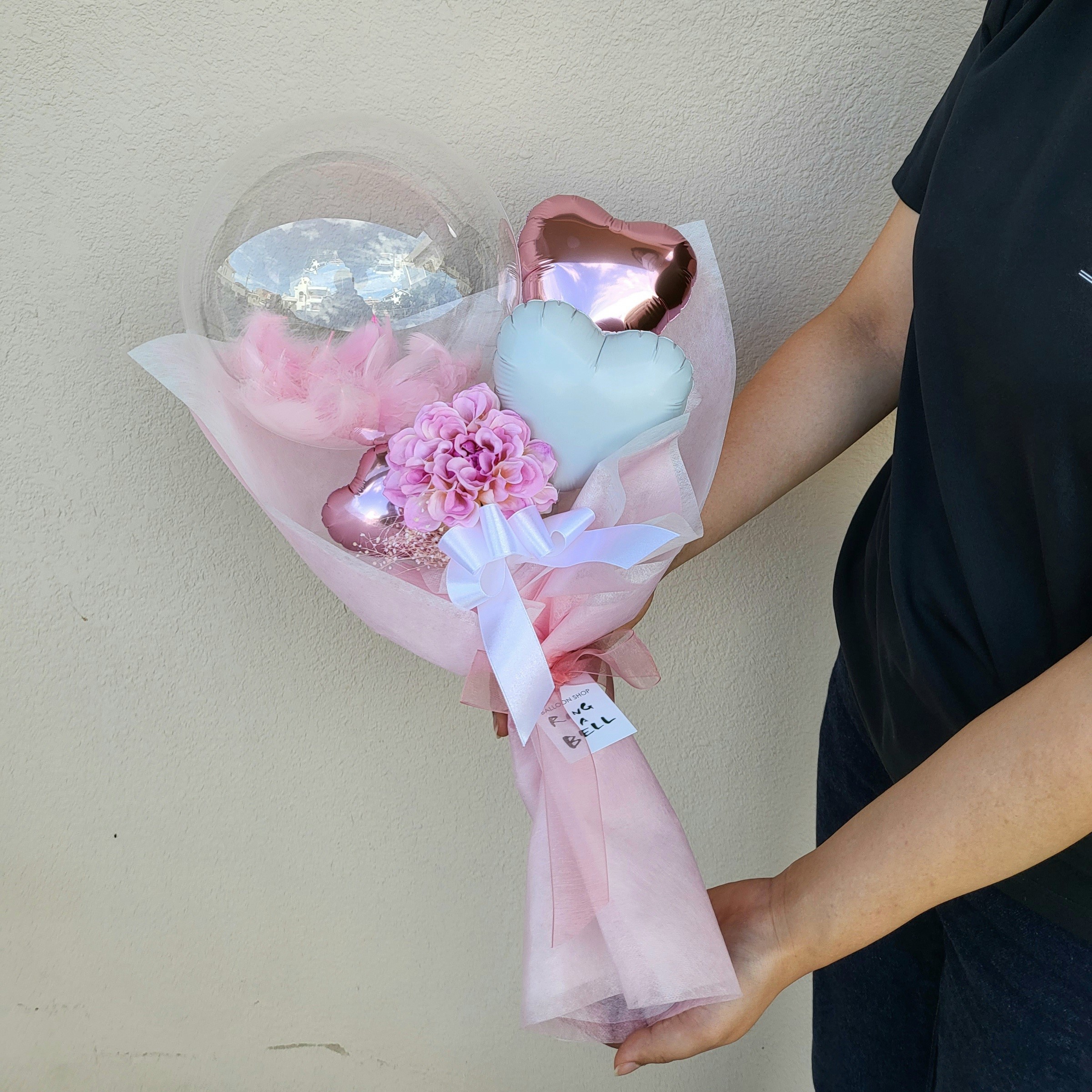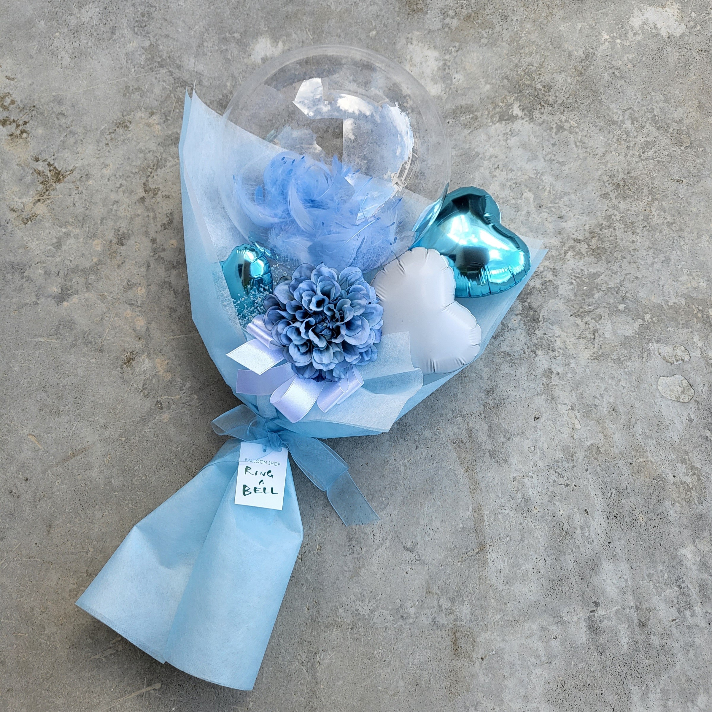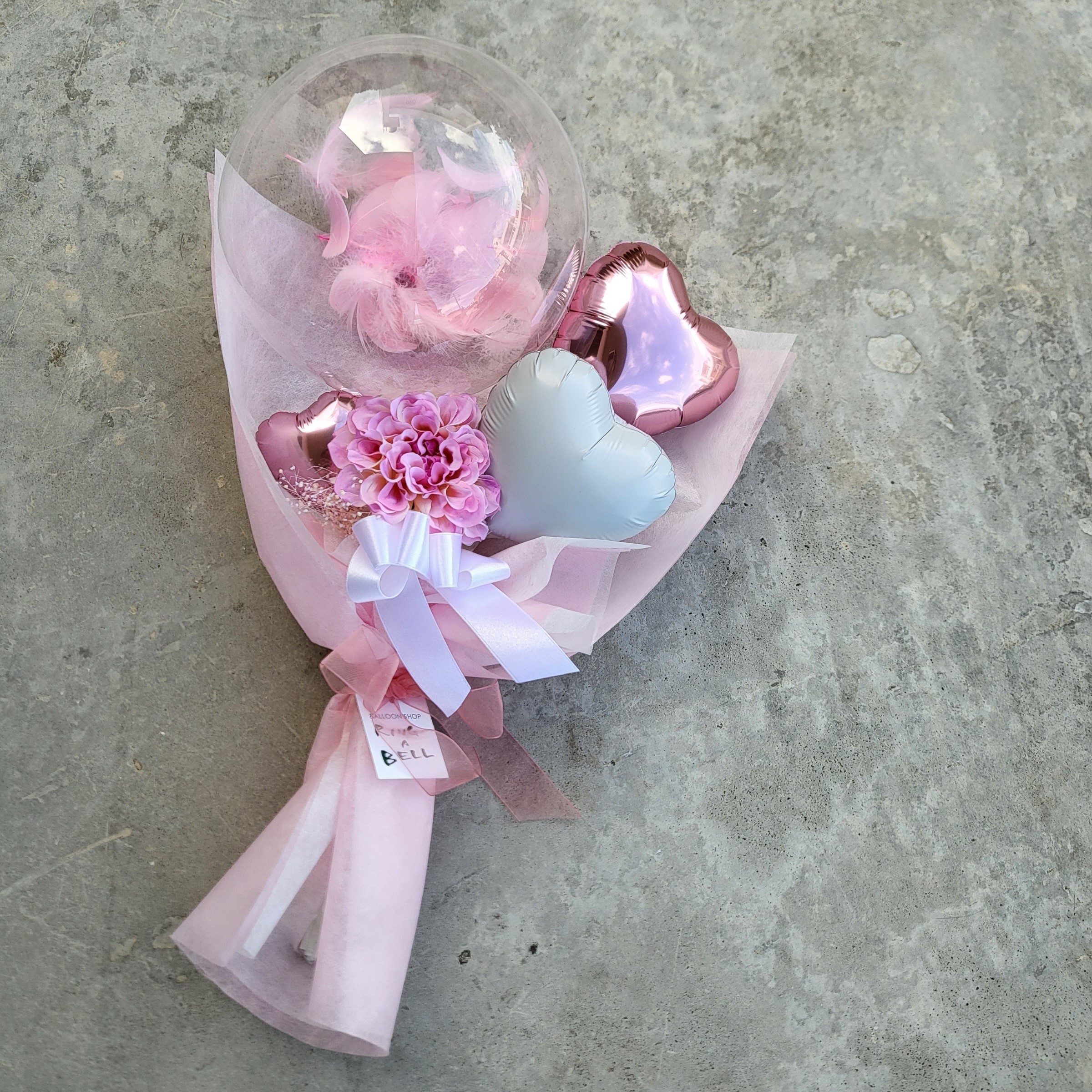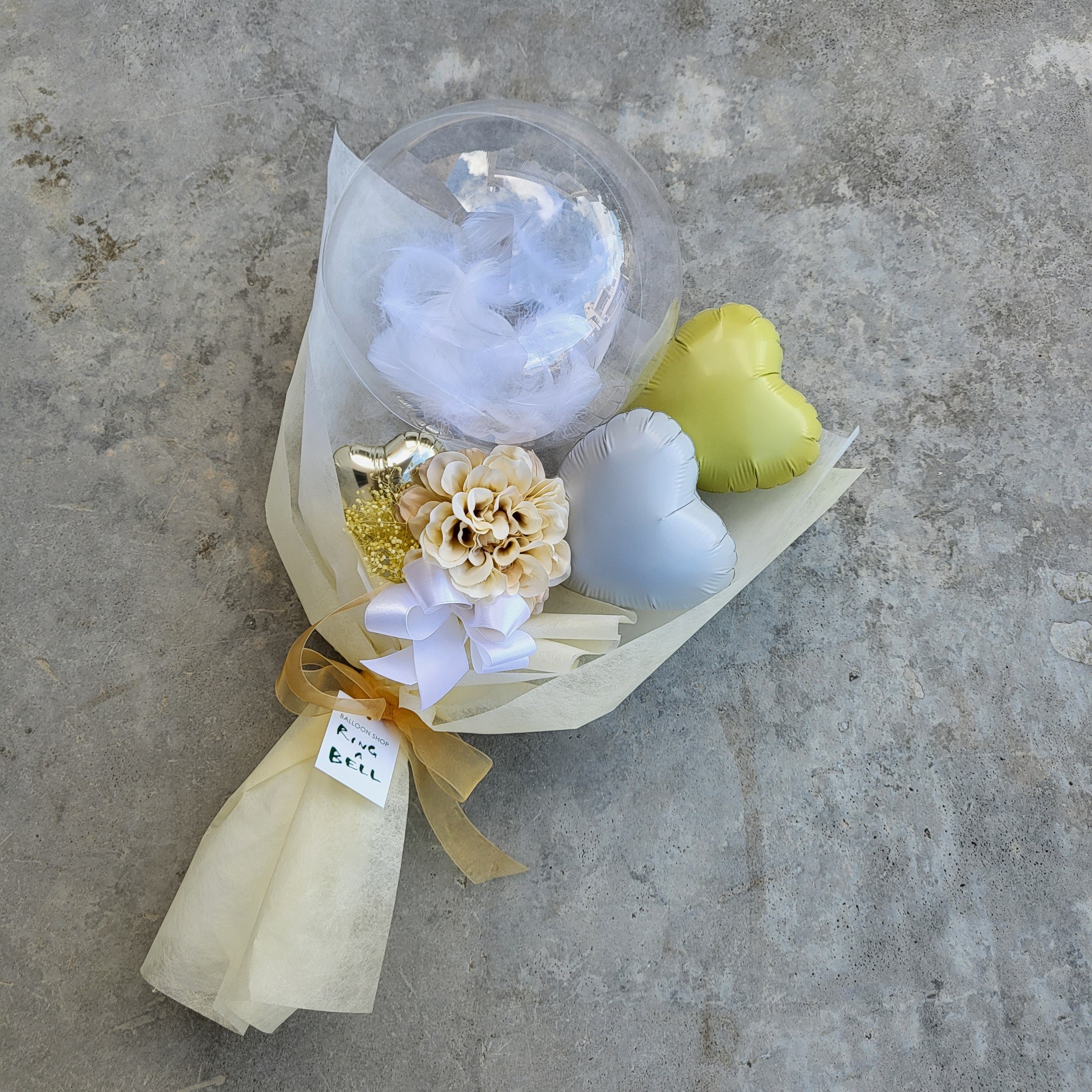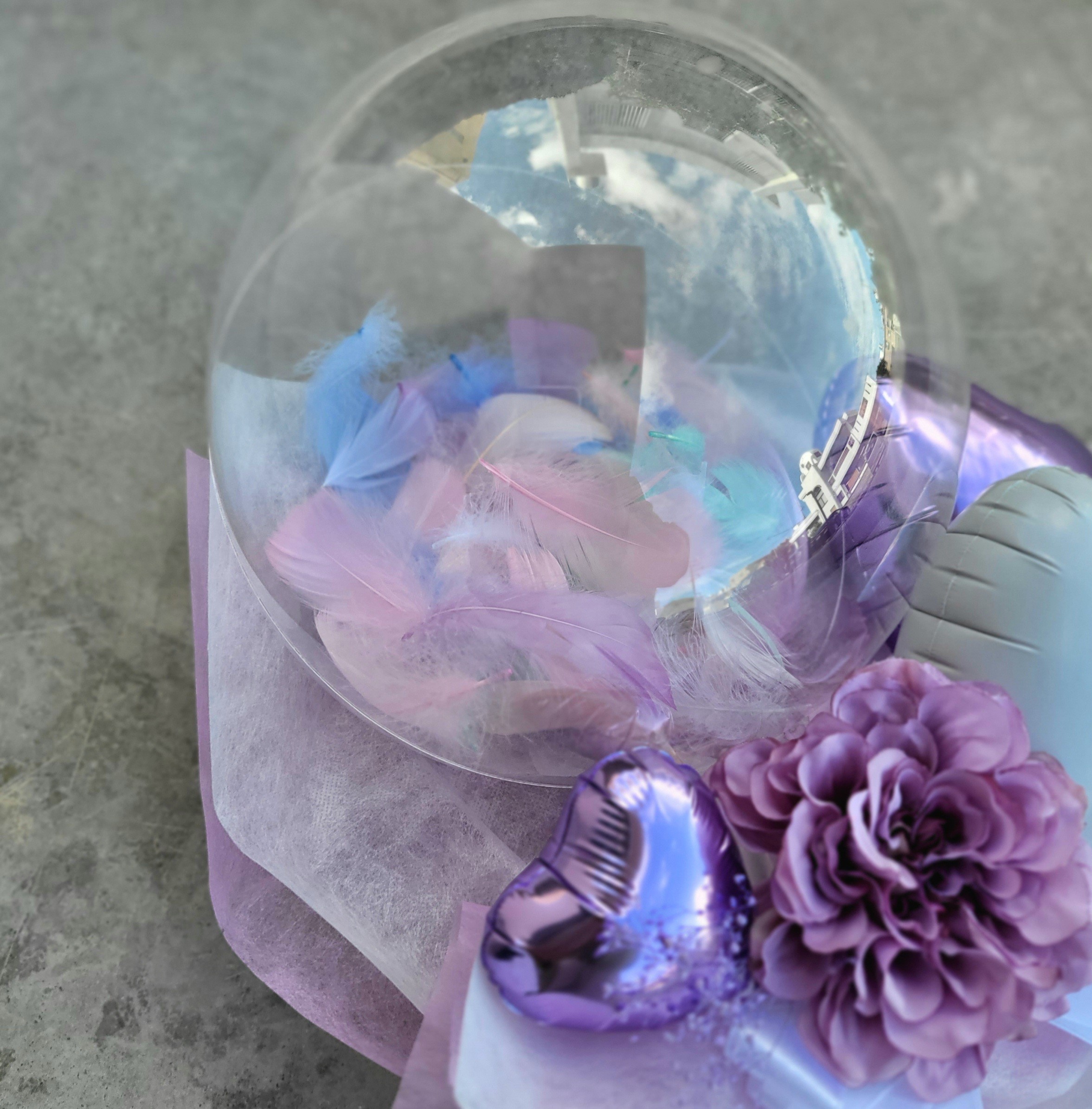 透明なバルーンの中に、ふんわりと羽を閉じ込めたバルーンブーケ。