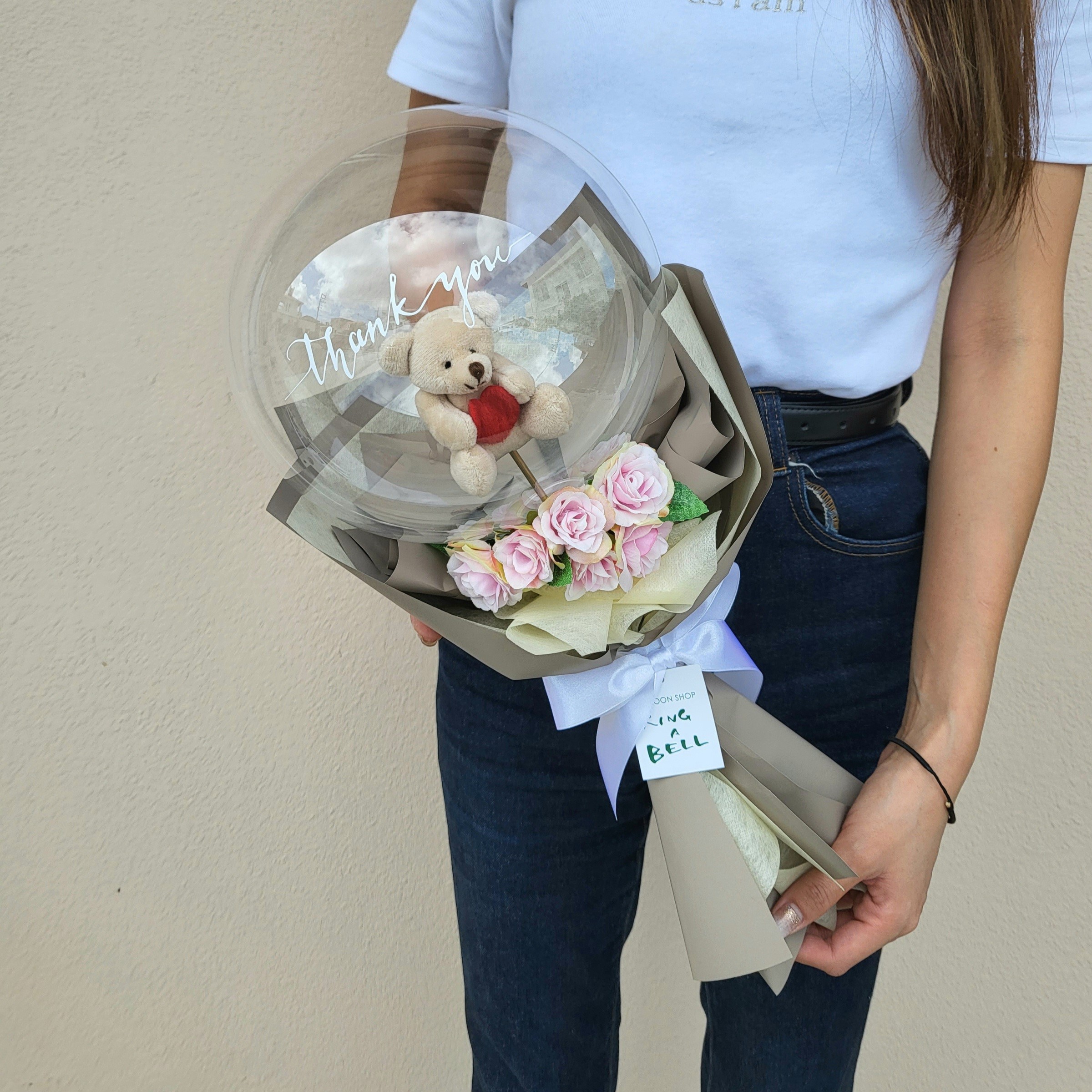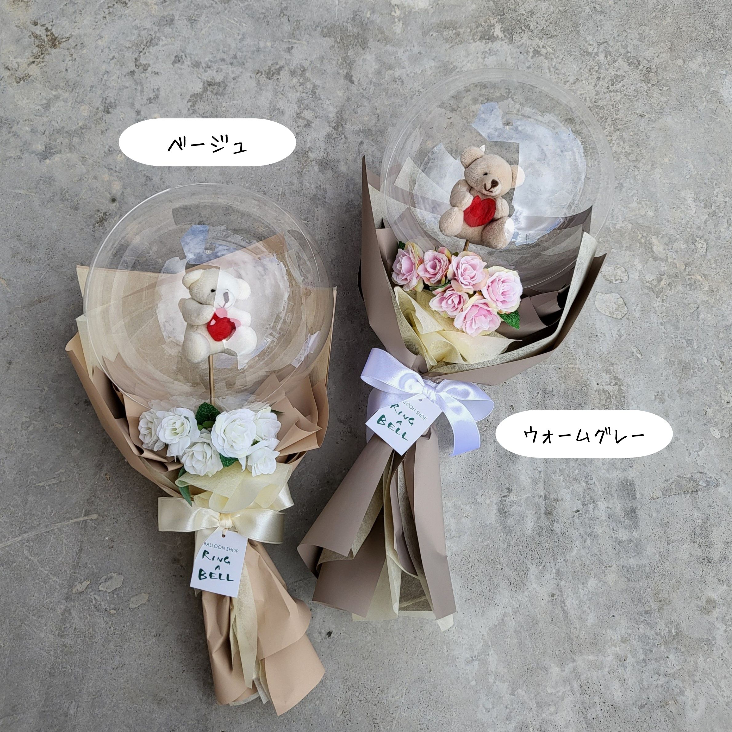 透明バルーンの中から、ハートを抱えたくまさんがお顔をのぞかせるキュートなブーケ。