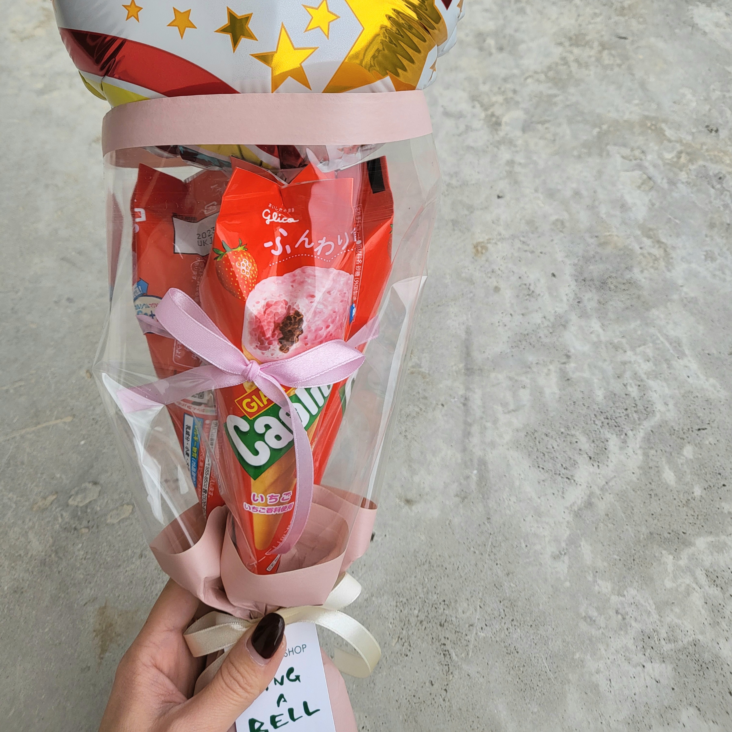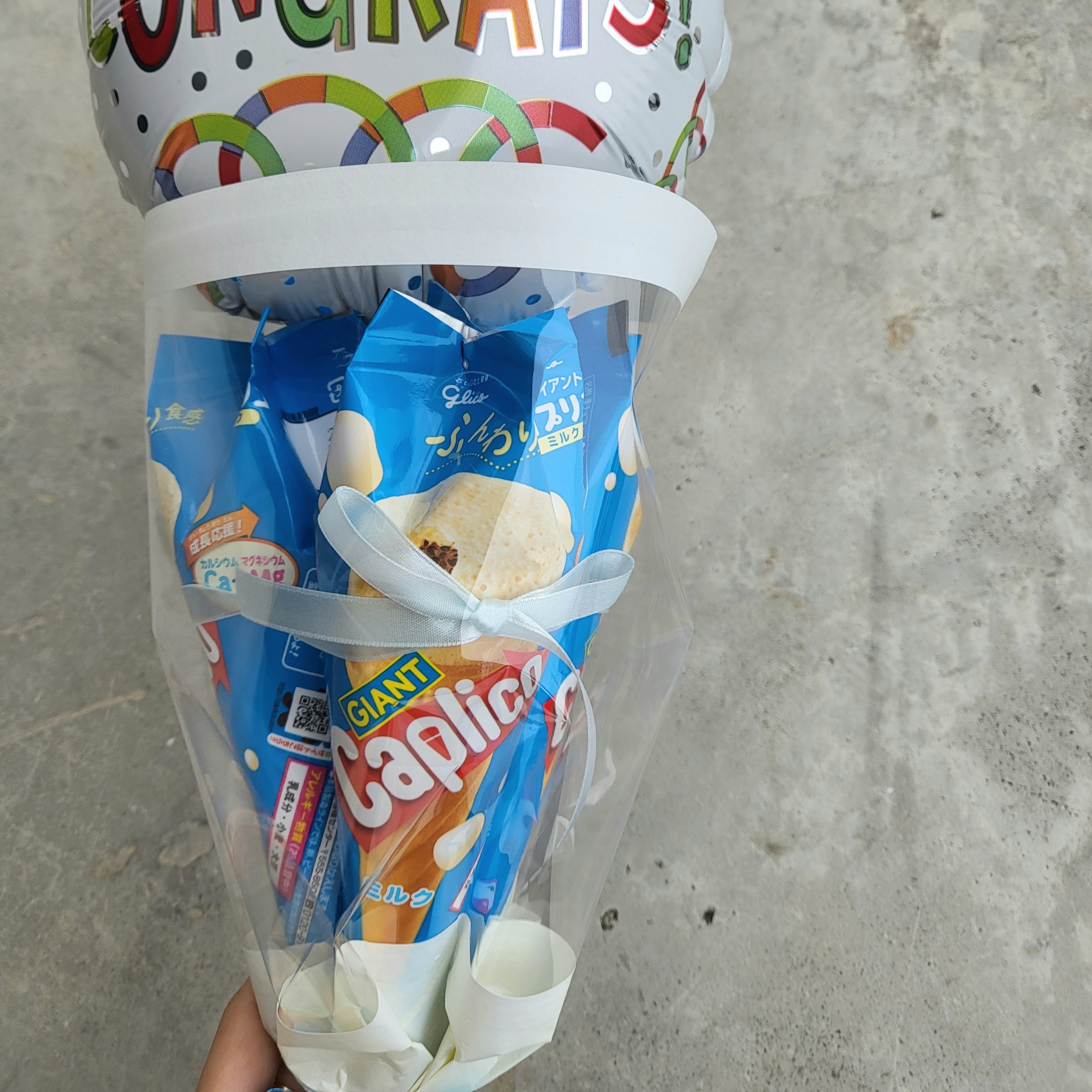 お菓子のカプリコ3本を可愛くブーケにしています。