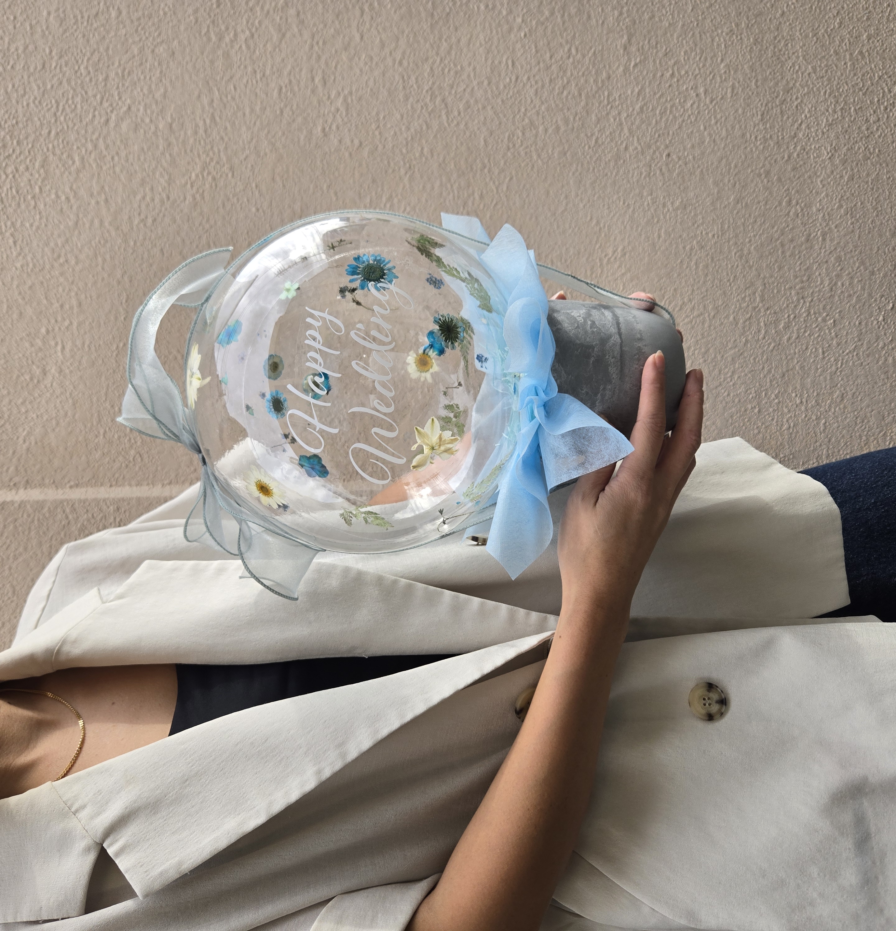 バルーンの中で舞う押し花がとっても可愛らしい贈り物。